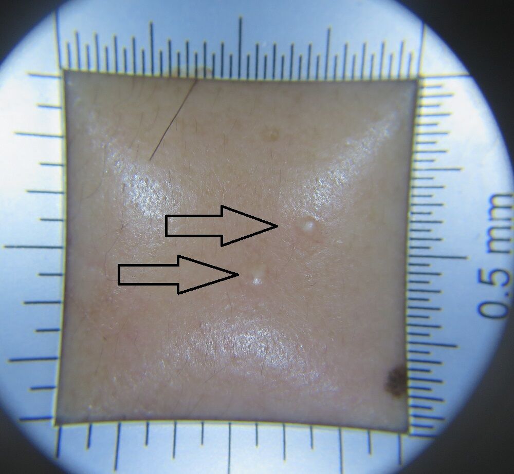 稗粒腫は皮膚の材料が集まって白いブツブツになって見えるでき物です。