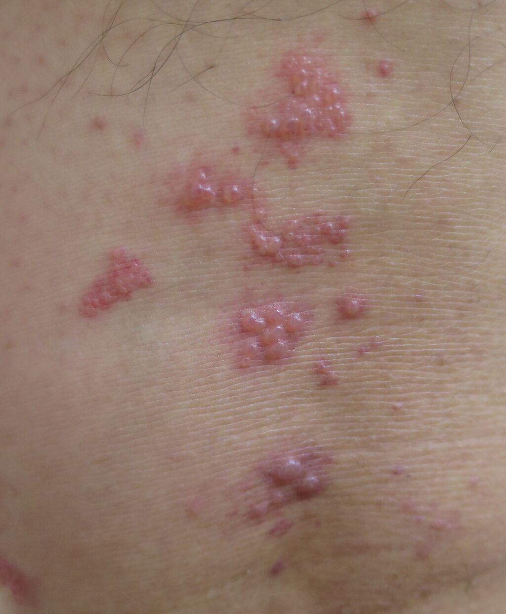ピンクの湿疹の中に小さな水泡が集まっているのが分かります。