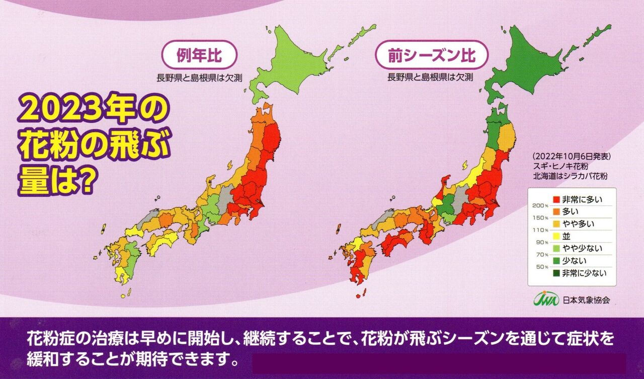 下は2023年のスギとヒノキの花粉の飛散予想図です。